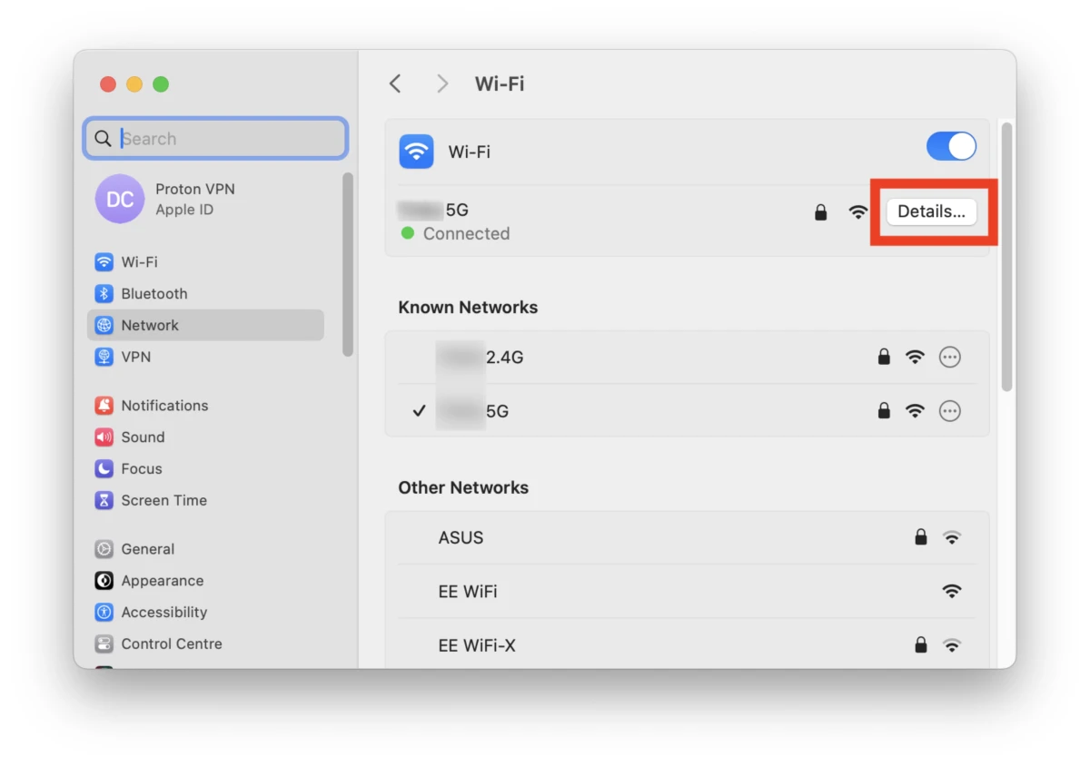 - Open System Settings from Launchpad, go to Network, and click the Details⦠button next to your network.
